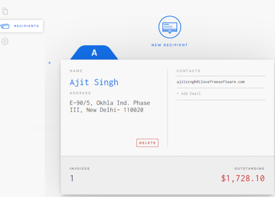 This important option is useful to add contacts which will come in handy while sending the invoice. You can add email addresses of recipients and at the time of sending the invoice, you can select a particular recipient to deliver the invoice.