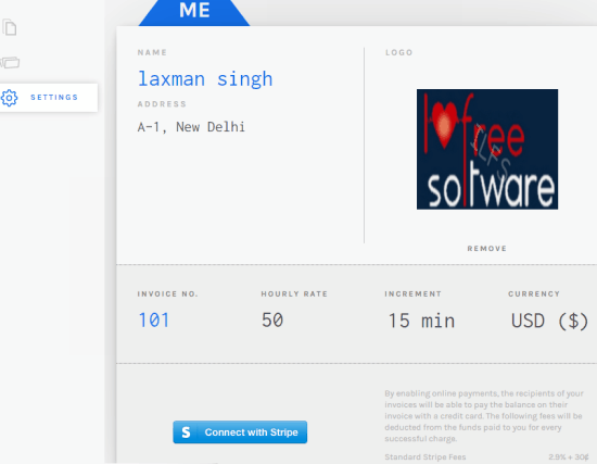 Using this option, you can ‘Connect with Stripe’ to enable and receive payments, add your details, and company logo that will be visible on invoice. You can also change currency, set invoice number, hourly rate, and increment for payments using this option.
