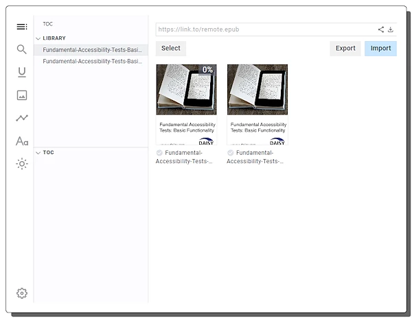 The main screen has an address bar at the top. You can paste a link to a book and add that to your library. When you open a book from your library, it generates a link for that book. You can use that link to share the ebook with others. Below that, you have an Export and Import button that you can use to add eBooks and backup/restore data (library and reading status).