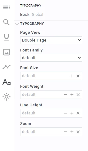 The Typography section lets you configure the Typography for the current book or the entire reader. You can set the page view (single/double), font family, font size, font weight, line weight, and zoom level. You can configure the Typography for each book and it remembers your preferences whenever you open configured books.