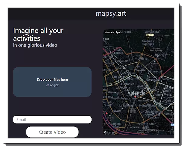 Go to the Mpasy.art website using this direct link. Drag and drop your .fit or .gpx file there. You can upload multiple files of various running and cycling activities. Then add your email address and click the “Create Video” button. Use a functional email address as it shares the video via email and not directly on the website.