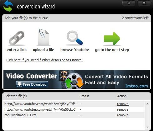 Step 1: On the website, if you have a link to a file that needs to be converted then you can directly enter it through “enter a link” on the “Conversion wizard” window. Otherwise you also have the option to browse YouTube right from the same window. Also you can upload a file from your computer directly to be converted. Then click on “Next Step”.