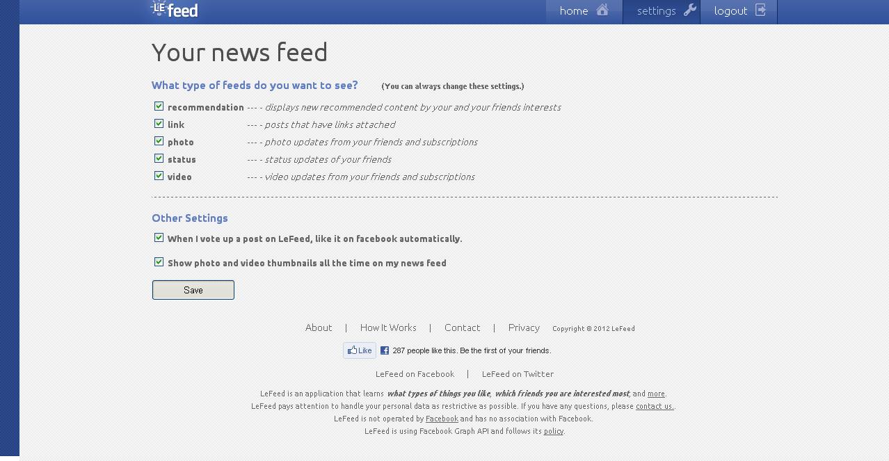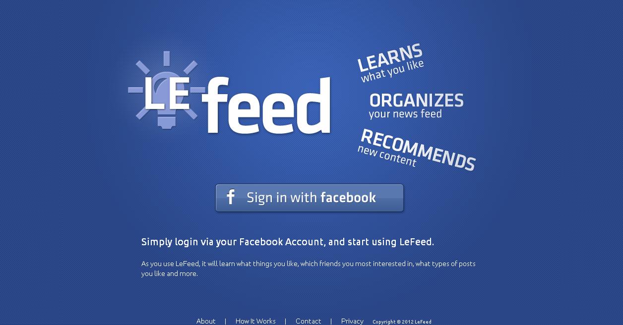 LeFeed is an intelligent, free feed organizer that helps you to organize feeds of your Facebook friends, and is built to record and learn the things you like while using Facebook. Obviously, you need a Facebook account to use this free tool to organize feeds of Facebook. Once you login to your account using the application it starts to analyze all your interests, interests of your friends and records the usage statistics.
