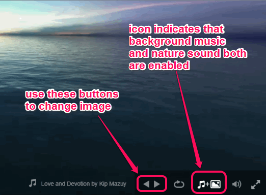 Jump to the homepage of this website by clicking on the link present at the end of this review. As soon as you will access its homepage, a default background music, and moving image (along with nature sound related to that image) will be visible to you. Listen to the sound and you will feel good for sure. To change the image, you can use next and previous button. With the change of image, background music, and nature sound will also change.