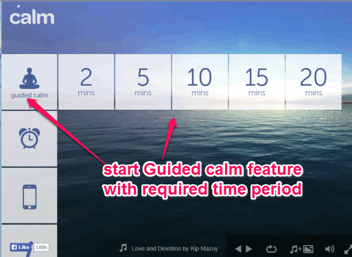 Guided Calm is one of the useful feature provided by this website. Preset time period, like 2 mins, 5 mins, etc are available to choose from to start the guided calm. In this feature, first of all choose any nature scene of your choice (available in this website). After this, place mouse cursor over Guided calm option to explore time period options. Select a time period and your Guided Calm session will start.