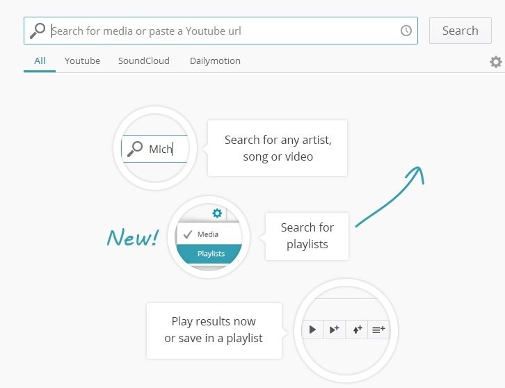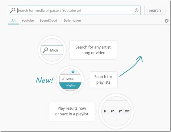 After you have created an account, you can click on the Media Search tab on the left side. After that you can type the name of the artist, song or album to search for a song and listen to it. You can also directly paste the link of the song or the video. The website shows all possible results of your typed search and you can choose from it. The website only shows results from YouTube, Dailymotion, and SoundCloud.