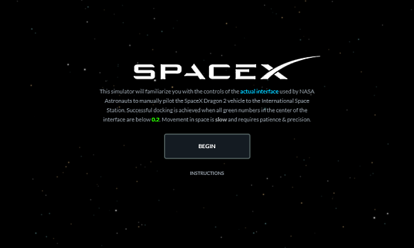 SpaceX – ISS Docking Simulator simulates an actually interface to manually point Dragon 2 that is used by NASA astronauts. The goal of this simulator is to help people get familiar with the controls. The controls include axes of rotation in roll, yaw, and pitch along with position controls. The control information shows on a head-up display and then you can take control to attempt the docking.
