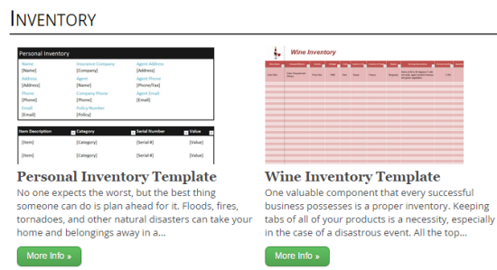 My Excel Templates is the next website in the list with various free inventory templates. From the list, you can see the thumbnail image and brief summary of each of the templates. All the templates include all basic fields like item description, category, serial number, value, inventory information, etc. There are some more fields, which differ on the basis of template you’re using. You can also modify, add, and delete any of the fields as per your choice.