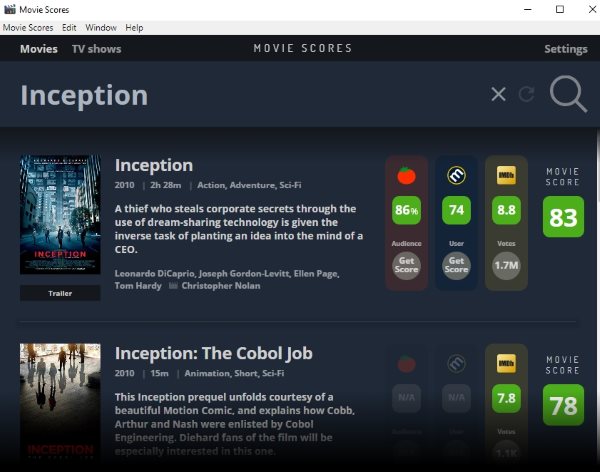 Lots of time it has happened with me that I pick up a movie to watch because it has a good star cast, or the plot of the movie sounds nice. Only to realize while watching how boring or non-interesting the movie is. At that moment I always think that I should have checked the reviews of the movie before watching it. Checking out how a movie has been rated will make your movie watching experience better. It will help you choose quality movies which will not feel like waste of time. Therefore, I found a Windows 10 app which does just that. Movie scores is a free Windows 10 app which lets you search for movies and shows its Rotten Tomatoes, Metacritic, and IMDb ratings. Seeing the ratings you can decide whether the movie is worth your time or not.