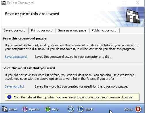 This screen as shown above will let you save your crossword to your computer. Apart from this you also have the option to print the crossword you just created, you can save the crossword as a web page, or publish your crossword.