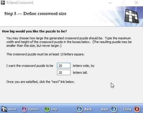 You can also add your name to the puzzle, and your name will be displayed on the web page you save. Click the next button and you will be asked to choose the size of your crossword puzzle, as seen in the screenshot below.