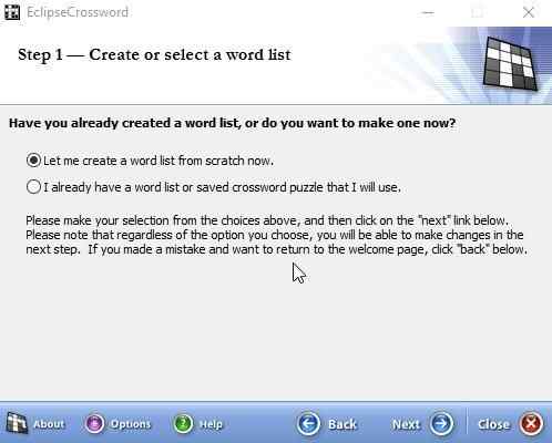 The Windows 10 create crossword puzzles app can be downloaded from the Windows 10 store or from the link given at the end of this article. When you start this app by clicking the launch button you will get a license agreement to agree with. After that your crossword creating wizard will start. The first screen in that would the one seen in the screenshot below.