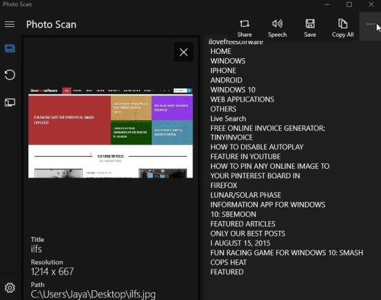 Now the text on the right side can be copied and used anywhere you like using the copy all button at the top right of the window. The save button lets you save this extracted text in a text file. The share option lets you share this text with your friends using various mediums. The speech option lets you listen to the text which has been extracted. It converts the text to speech and you can hear it before using it.