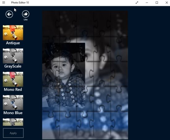Photo Editor 10 is nice app to edit photos and make them look amazing. You can choose from a lot of filters and effects, add frames, picture in picture effect, etc. Edited images can be saved in JPG format on your computer. The app does its job well and lets you create nice photos which you can easily share with your friends. Do give this app a try.