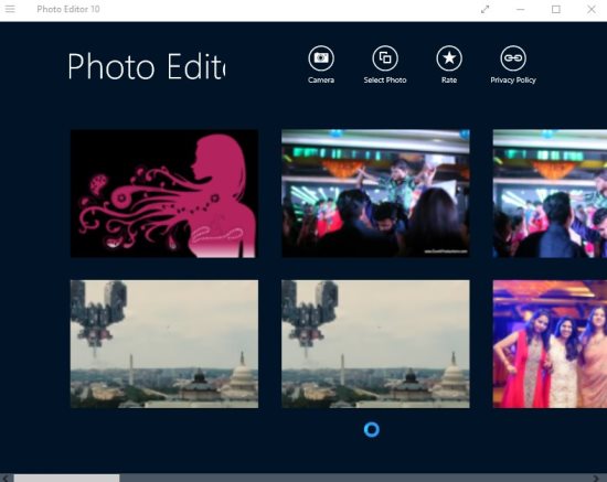 Photo Editor 10 can be downloaded from the Windows 10 store or you can download it from the link given at the end of this article. When you start this app for the first time you will come across an interface like the one seen in the below screenshot.