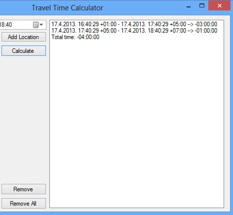 After clicking on calculate, you should see travel times for each individual flight calculated on the right, and down below the total flight time should be listed. To repeat the calculation, just click on Remove All, add new values to the list on the left and then perform the calculation again.
