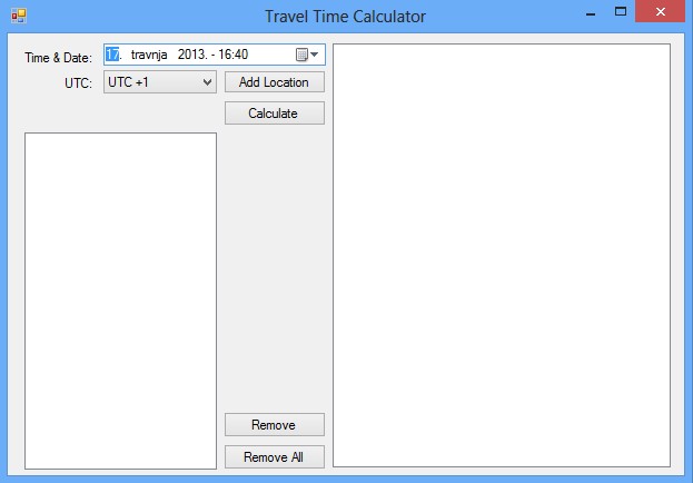Empty area on the left is reserved for a list of locations that you’ll be visiting when traveling. Using the UTC drop down menu, you can set a different timezone for each one of the locations. Multiple locations can be added. Cross Timezone Travel Time Calculator will calculate the travel time between each one of the locations individually and then report back the overall time that it will take for you to get to the desired locations. This is very useful when you’re having transfers in different timezones.