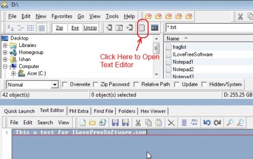 Another interesting feature of this free file explorer is that it comes with built-in text file editor. Just click on any text file and click on “Edit Text” icon in the toolbar. It will open a basic text editor in the bottom pane. Here you can quickly edit contents of text file. It comes with basic features like undo, redo, search, etc.