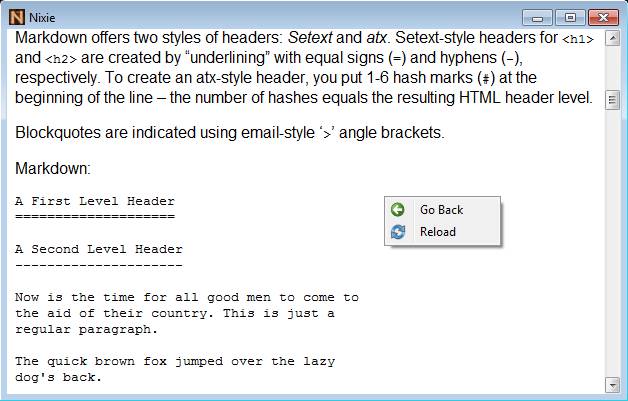 In order to be able to create these types of documents, which can be viewed and read by Nixie, you need to learn to some extent the Markdown syntax. We said that there aren’t any kind of menus, but that’s not entirely true, since when you right-click on the document you can reload the document if you’ve edited it, or you can Go Back to the previous document, if you’ve had any opened.