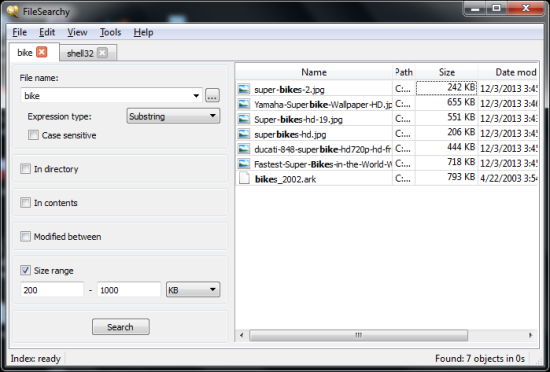 FileSearchy is a free and powerful file search utility that lets you quickly search folders and subfolders for files. It can search for the exact phrase typed in, a sub-string or even with a regular expression. FileSearchy also lets you open results in tabs. You can also filter out the results with the file size that falls in a range or match the exact file size. FileSearchy also lets you find files that we modified on specific date and lets you search in specific directory (folder).