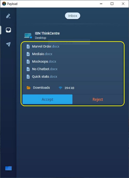 5. On the Destination click on the ‘Inbox’ icon on the left vertical bar and then click on ‘Accept’. The files will be saved in the default Downloads folder of your device. If you want to save them on an alternate location, click on the arrow mark beside the ‘Downloads’ folder, click on ‘Browse, choose the Folder where you want to download the files and then click on ‘Accept’ in the Payload window. If the data was sent accidentally, you can click on ‘Reject’ to delete the transfer.