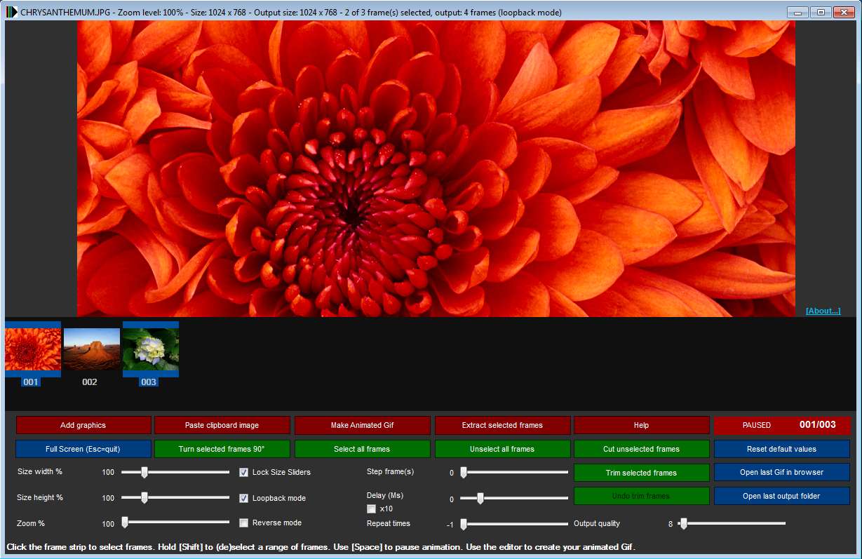 Images are gonna open up as frames, same thing is true for videos that you open up, you can see the three frames on the image above. After that you can start editing the animation. To resize frames, select the ones that you want to resize and move the Size sliders. Frames can be rotated by clicking on the Rotate button. Quality of the GIF animation can be set with the Quality slider in the bottom right corner. When you’re done with all the setup, you can save the animation by clicking on the Make Animated GIF button. You’ll be offered the standard Save file dialog. That’s it, your animation is finished.