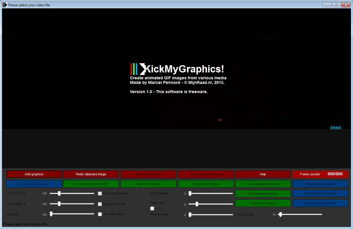 KickMyGraphics is a free GIF editor which you can use in order to create GIF animations, convert videos to GIF, optimize existing GIF animations for the web, enhance their quality and do all this with a very large number of options to change and edit, Large number of video formats can be opened and converted also.
