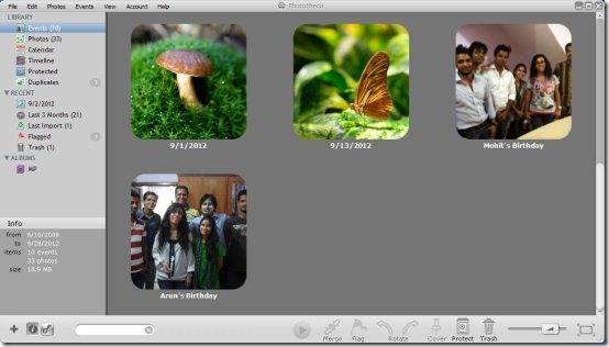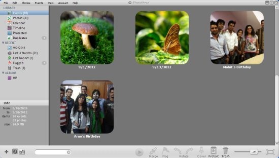 - Events: The moment you import photos on phototheca, it will automatically create events based on different time stamps. The photos that were taken on one day goes into one event. You can later, merge several events into one if the event comprises of many days, or even split a single event into multiple events.