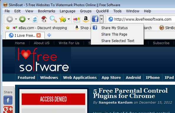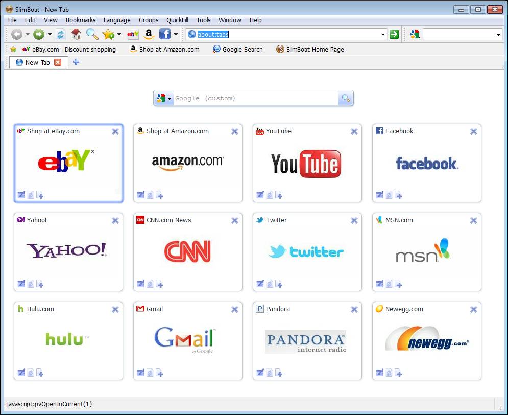 Image above shows us the default interface of SlimBoat and you can see right away what we were referring to when we said that SlimBoat comes packed with options. Notice at the top that the classic menu is rich with options and down below you have by default toolbars for eBay, Amazon, Facebook and a little further down below at the bottom you can see that several frequently visited websites are preloaded by default. Here’s a quick overview of the most important features that SlimBoat has to offer.
