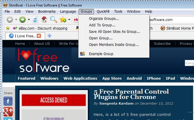 Most of us have favorite website that we visit frequently, and the more we browse the web that list of website narrows down to just a few. If you want to access those few websites quickly, you can do that easily with the groups feature of SlimBoat. Website can be added to groups and then all the websites from that group can be quickly opened, each in its own tab.