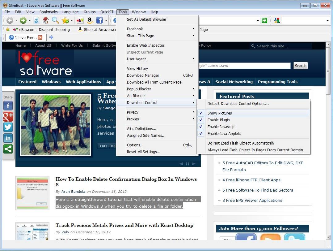 One of the things that’s very useful to have installed on your web browser would definitely be an ad blocker, image blocker, and every other kind of blocker that you can think of. With SlimBoat you get that by default. Access them by clicking on Tools and there look for Ad Blocker and Download Control.