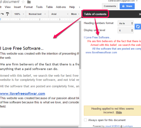 Step 4: In the sidebar, you can set Heading numbers format (original or 1.2.3), and can also set display level to create the table of contents. Once you are done, click on Refresh icon. It will read the document and search for headings. After this, a neatly structured table of contents will be in front of you.