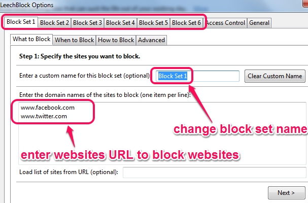 Step 1: You will find multiple block sets on this window and you can select any block set, say Block Set 1, to add websites to block list. Give a name to selected block set, add websites urls (one URL in one line) at the required field, and click next to move further.