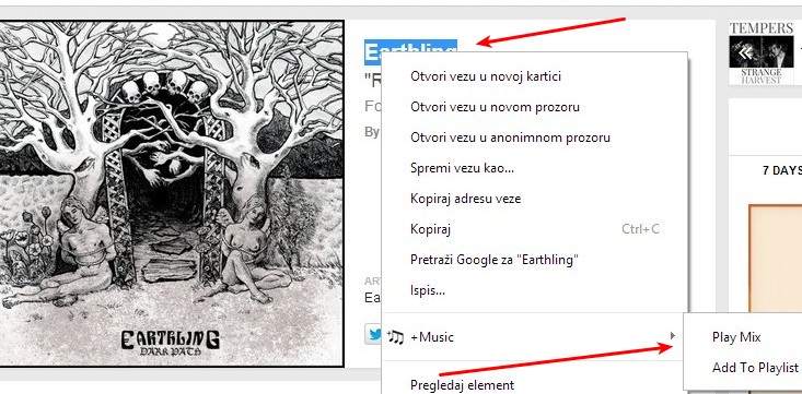 Second method of how you can quickly add songs to the playlist is by selecting the artist name on a website, right clicking and then picking the appropriate option from the +Music menu. It’s the same to manually search for songs, only it’s quicker, just like right click Google search is faster.