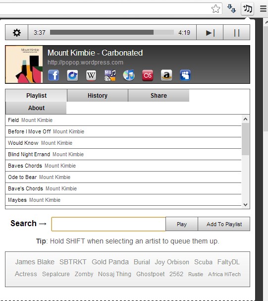 This free music player Chrome extension appears in the form of a pop up, when you left click on its icon from the toolbar. Initially there won’t be any artists added to the playlist, only the search box which can be seen all the way at the bottom of the window. Playback controls are available all the way at the top. Down below album art with links to the artists Facebook, Wikipedia, and several other online services.