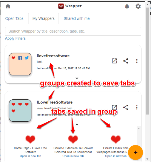 Later, when you have to restore saved tabs, you can use the same My Wrappers tab in pop-up menu and then click on Open icon.