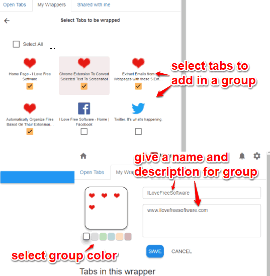 Wrapper is a free Chrome extension to save opened tabs in groups, restore saved tabs, and share your tabs with others. This extension is very useful when you access same webpages daily or frequently. Instead of bookmarking the tabs manually or open those tabs one by one, this extension is better to use. It shows the list of all opened tabs in a pop-up. From that list, you can select tabs and then create a new group (known as Wrapper) to save those tabs. Later, you can use the same extension pop-up to restore saved tabs. For each group, you can also set any of the available colors.
