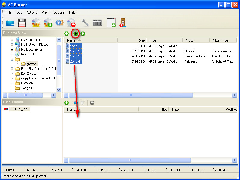 Be careful when you are selecting a Data DVD creation session, because the Data disc button is divided into two sections. On the top side are CDs and on the bottom DVDs. It’s important which one you pick, because if you don’t select DVD, then you will not be able to add more that 700MB worth of data, which is the space limitation of CDs.