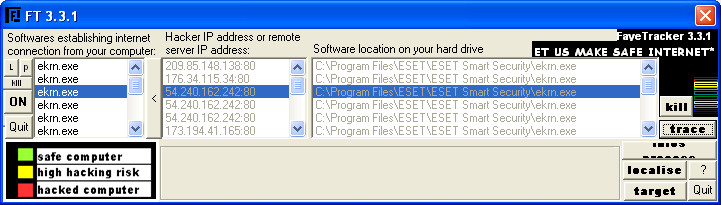 FayeTracker can be used to detect these connections and use them against the hackers who have infected our computers. Process that is connected to the internet on the image above belongs to NOD antivirus and it’s not something to be alarmed about. Good connections will also be mixed with the bad ones, the trick is to detect which ones are bad, and then use the Hacker IP address or remote server IP address field to find out what is the IP address of the remote location where malware is connected to. For detection of harmful processes you’re gonna need some practice, but it basically boils down to tracking which process isn’t familiar to you, Googling the process and reading what kind of comments are associated to it. IP address which FayeTracker will detect can also be used: