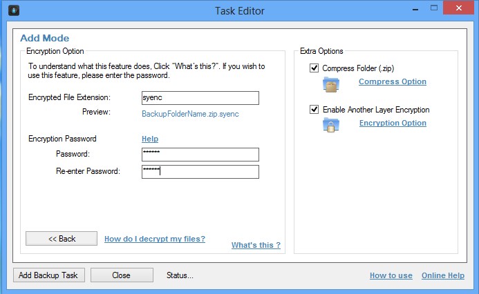 Task Editor window will pop-up when you select the Regular Mode. You’ll finish faster if you use the Regular Mode, it’s not very difficult. Select the backup folder location, destination location and most importantly the backup mode. It can either be sync or overwrite. Put check marks for extra options if you want to Compress the backup and add additional protection by also encrypting the archive. Password can be added when compressing folders also.