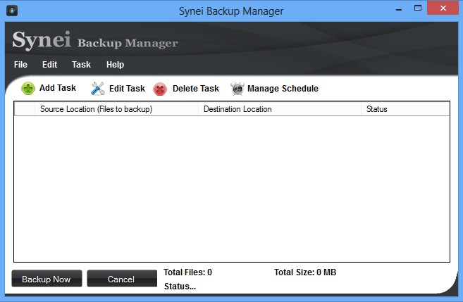 When starting Synei Backup Manager for the first time, you’re only gonna see an empty task list, the one which can be seen on the screenshot below. In the top left corner, just below the logo, you can see a classic menu underneath which controls for adding new data backup tasks, editing existing ones and managing the schedule are available. Bottom left corner holds the most important button basically, the Backup Now button.