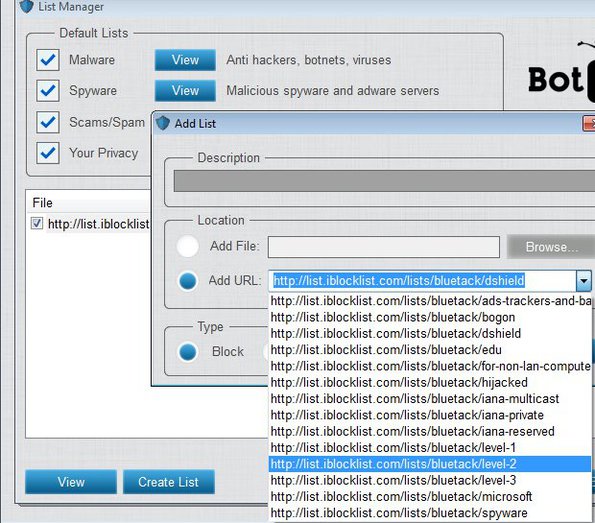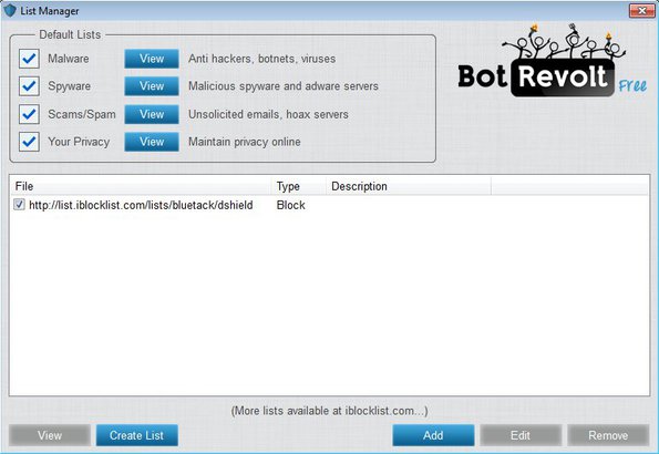 When you have the list manager opened up, click on the Add button down below so that the Add List window comes up. Malicious IP addresses and ranges can also be typed in manually or imported using files. Bot Revolt works with iblocklist.com which allows you to easily add malicious IP addresses from their website directly into Bot Revolt. iblocklist.com is a website where you can find various different IP address lists. Select the list that you’re interested in blocking from the drop down menu, put a check mark next to Block, to actually block them and click Add.