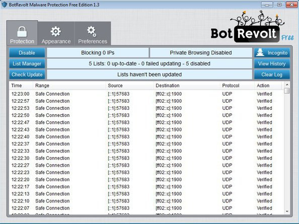 Bot Revolt Free is a free malware connection detection software for Windows. Instead of scanning your files for signs of infections, Bot Revolt monitors active internet connections. It checks to see where processes from your computer are connecting to, to which IP addresses and it then compares detected IP address with its list of malicious IP addresses, blocking connections that are in fact malicious, created by malware and viruses.