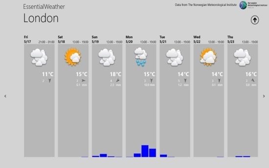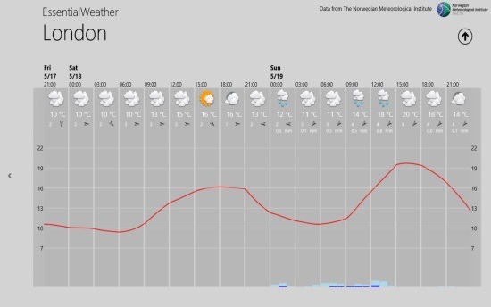 This Windows 8 weather app is fast and fluid, and it is quite light weight: just under a MB. Essential Weather provides you with the weather details in 7 days overview or 48 hour overview. The 48 hour overview provides you with detailed graphs that plot the average, max, and min temperature.