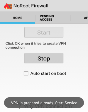 Step 1: After you install and open the app, you will see “Start” and “Stop” buttons on the home tab. Tap the start button and allow access to VPN connection to make this app work properly. It doesn’t actually connects to a VPN server and instead works as a firewall to block apps to access the Internet on mobile data. Simply tap the stop button when you are done using the app.