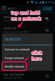 Step 2: To change DNS settings for a particular network, tap and hold on that network. You will find Modify network option, just like visible in screenshot below. Click on that option to move to the next step.