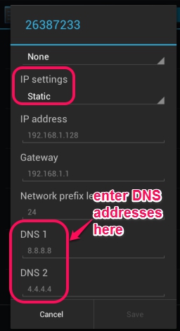 By modifying the selected network and using the Static IP settings on Android, you can add any custom DNS server. Do note that, if your phone is not rooted (or you haven’t root permissions on your phone), then new DNS server settings will be applied for Wi-Fi network only (not for 3G/4G data network).