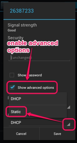 Step 3: In this step, you need to click on show advanced options. This will help you to view IP settings. By default, it will be DHCP (Dynamic Host Configuration Protocol). You need to switch to Static IP settings. Click on available drop down menu icon to change settings.