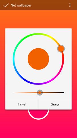 Simply tap on anyone of the circles and you will be provided with a color picker. Use this to pick the color along with its intensity. When you have selected the color of your choice tap on the change button to add it. Similarly you can change the other color in the wallpaper to the one of your choice and like by tapping on that circle and selecting a new color.