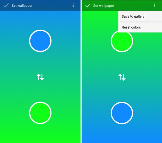 If you like, you can quickly switch the color at the bottom with the one on the top by simply tapping on the arrows located in the middle of the interface. Now if you like the wallpaper which you created using Mixt for Android, then you have the option to set it as the wallpaper by tapping on the option located on the upper left of the app window or you can use the menu option and save the image to the gallery.